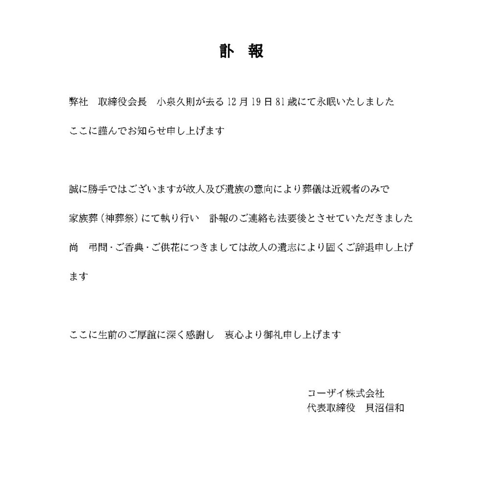 会社広報 コーザイ株式会社小泉久則コーザイ会長 訃報 弊社会長 小泉久則急逝のお知らせ 2025年12月25日 尚、お別れの会(仮称)は年明けしかるべきタイミングで開催することを検討中です。 お別れの会等開催する際は別途お知らせいたします。 Facebook Twitter